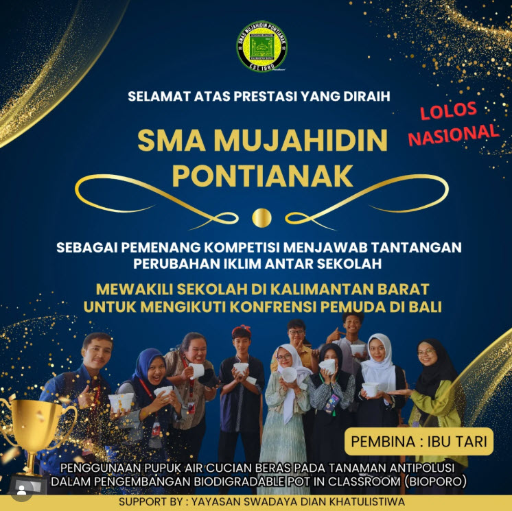 “Kami bersyukur, tim SMA Mujahidin Pontianak berhasil menjadi pemenang dalam kompetisi menjawab tantangan perubahan iklim antar sekolah. Kemenangan itu bisa diraih berkat inovasi penggunaan pupuk air cucian beras pada tanaman antipolusi dalam pengembangan biodegradable in classroom (biopro),” terang Kepala Sekolah SMA Mujahidin Pontianak Irham Chandra ST, MT, Kamis 17 Juli 2025.